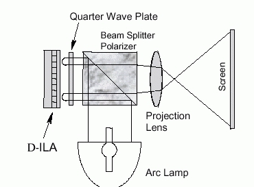 Die Pixelelektroden reflektieren wie kleine Spiegel. Davor befindet sich die Flüssigkristall-Schicht, durch die das Bild erzeugt wird. Durch einen halbdurchlässigen Spiegel wird das Licht der Projektionslampe auf das LCOS Device geworfen, reflektiert und durch Optiken auf die Leinwand projiziert.