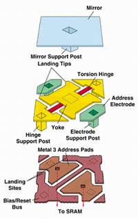 Die mikroskopisch kleinen Spiegel bestehen aus drei Schichten. Zwischen den Schichten sind winzige Zwischenräume, die es dem Spiegel erlauben, zu kippen. Jeder einzelne Spiegel ist in der Lage, sich mehr als 1000 mal in einer Sekunde zu bewegen. Diese enorme Geschwindigkeit macht es möglich, verschiedene Graustufen einfach durch die Häufigkeit des Kippvorgangs zu erzeugen.