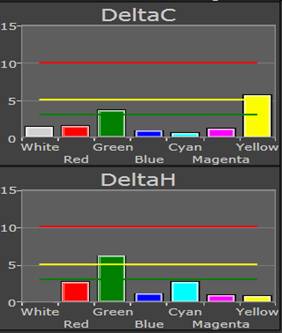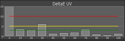 Typisch für die Serie sind aber eine leichte Verschiebung der Grundfarbe Grün ins Gelbliche, sowie eine leichte Überbetonung von Sekundärfarben (je nach Gerät unterschiedlich), wie die weiterführenden DeltaE Diagramme zeigen.