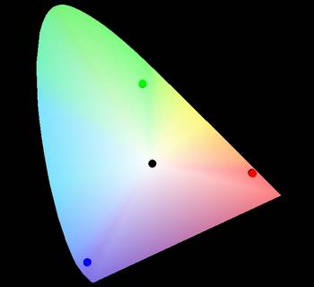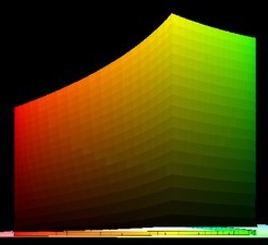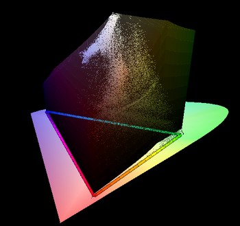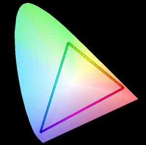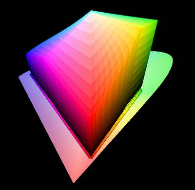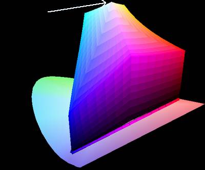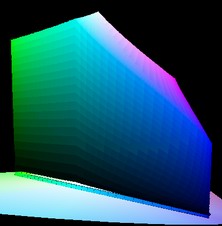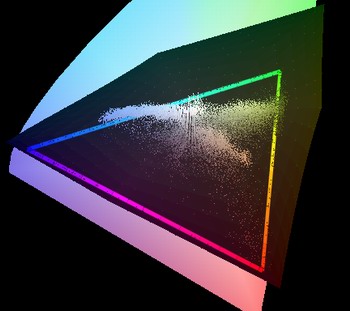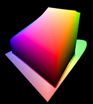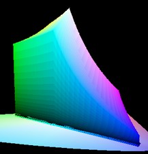 Diese zeigt, dass der Farbraum mit hellen Farben gleichmäßig aufgespannt ist und sich zum „Weißgipfel“ in der Mitte addiert. Dies bewirkt eine leuchtende Farbdarstellung.