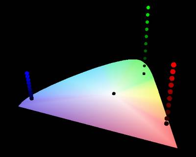 Da die Helligkeiten der Grundfarben sich nicht automatisch zum Weißpegel addieren, müssen wir sie nun separat (nach Color Light Output Verfahren) messen und abbilden, nur: Leider sind sie bei der herkömmlichen Abbildung des Farbraumes unsichtbar, denn sie verstecken sich in der z-Ebene, also der Höhe…