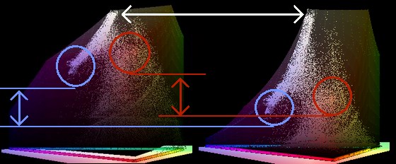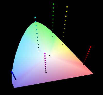Obige Diagramme zeigen den Farbraum unter Einhaltung der Videonormen, sind also Beispiele dafür, wie es sein soll. In der dreidimensionalen Darstellung des Farbraumes werden die Farbhelligkeiten in Bezug zu dem maximalen Weiß deutlich.