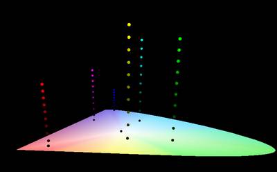 Doch wie bereits erläutert, werden die wichtigen Helligkeitsinformationen der Farben hier nicht abgebildet, denn es handelt sich hierbei gleichsam um eine Aufsicht von oben, die die Höhe (z-Achse) außer Acht lässt. Kippt man das Diagramm und den Videonormfarbraum in den Raum, so sieht man, wieso der Farbraum seinen Namen „Raum“ auch verdient: