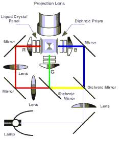 Das hellstmögliche Weiß wird projiziert, indem jeweils das hellste Grün, Blau und Rot des Projektors überlagert, also gleichzeitig projiziert werden. Technisch sieht das bei einem 3Chip Projektor intern so aus: