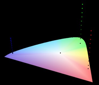 Obiges Diagramm zeigt das klassische Farbraumdiagramm, wie es in den meisten Projektoren-Tests zu finden ist. Es zeigt die Grundfarben der Videonorm in Farbton und Sättigung (Eckpunkte) und die möglichen Farbtöne, die sie aufspannen (Fläche Dreiecksinhalt).