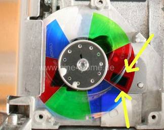 Während das Farbrad zur nächsten Farbe Grün wechselt, gibt es eine Übergangsphase, in der beide Filterelemente gleichzeitig vor dem Lichteintrittsfenster positioniert sind (Skizze oben). In dieser Zeit ist es aber nicht möglich, eine Farbe individuell zu modulieren, daher muss der DLP-Chip während dieser Transportzeit komplett abgeschaltet (schwarz) sein. Vergleichbar ist dies mit dem Shutter eines analogen Filmprojektors: Auch er muss die Leinwand dunkel schalten, während der Zellulloid-Streifen von einem Einzelbild auf das nächste transportiert wird (24x / Sekunde).