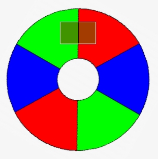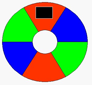 Im obigen Diagram sehen wir das Farbrad in dem Moment, indem das rote Filtersegment das Fenster komplett abdeckt. Nur in diesem Moment hat der DLP-Chip Zeit, die Rotanteile des Bildes zu modulieren. Im nächsten Moment verändert sich Situation durch die Drehbewegung des Rades
