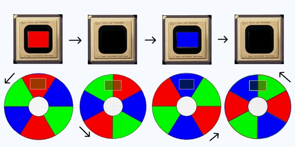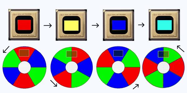 Pro Umdrehung wird also jede Grundfarbe durchlaufen und der Farbkanal von dem DLP-Chip in dieser Zeit entsprechend moduliert. Durch die hohe Umdrehungsgeschwindigkeit (bis 7200U/min) erfolgt diese zeitlich versetzte Farbdarstellung so schnell, dass sie vom Auge nahezu unbemerkt bleibt. Lediglich empfindliche Augen beobachten den so genannten „Regenbogeneffekt“ an starken Kontrastübergängen: