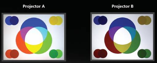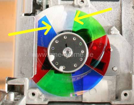 Noch gravierender wird der Unterschied, wenn ein Projektor ein auf Helligkeit getrimmtes Farbrad aufweist, meist mit Gelb- und Weißsegmenten neben den Grundfarben: