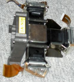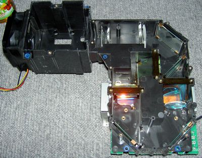 In einem G10 sieht das Ganze so aus: Das Licht der Lampe (oben links im Bild die Kammer), gelangt nach passieren diverser Intregator-Linsen über einen Spiegel (oben rechts) in den optisch Block. Dort wird es durch einen halbdurchlässigen Spiegeln in Blau und Gelb aufgeteilt (rechts).
