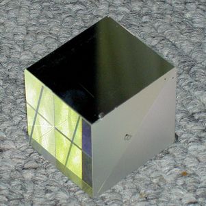 Die sogenannten "Polarization Beam Splitter" sehen aus wie Glaswürfel. In sie ist der spezielle Polarisationsabhängige Spiegel eingelassen.