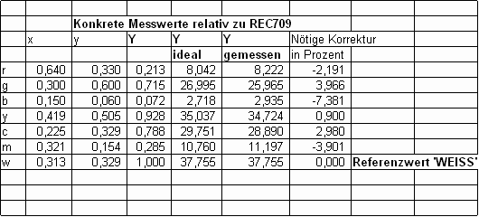 Der Weißpunkt D65 entsteht - wie beschrieben - durch korrekte Teilintensität der Primärfarben Rot, Grün und Blau, wobei die graphischen Darstellungen, die die Grausstufenmessung als gleich hohe Balken von R/G/B darstellen, irreführend sind, weil sie ein Mischverhältnisse aller drei Grundfarben von 100% suggerieren. Besser ist eine neutrale Darstellung des Weißpunktes als getroffenes Fadenkreuz, wie weiter unten in Abbildung7 zu sehen (die CIE-Target-Darstellung, die sich auch für eine Repräsention von DeltaE aller Farben und Graustufen einsetzen lässt). Die festgelegte Norm bezüglich des Referenz-Farbraums REC709 fordert eine Luminanz-Mischung für Referenz-Weiß aus exakt 21,3% Rot, 71,5% Grün sowie 7,2% Blau, was sich in Abbildung2 anhand eines gesetzten Referenz-Wertes für Weiß von 1,000 (= 100%) nachzuvollziehen lässt! Umgekehrt folgt (allerdings eben nur theoretisch!) aus der Helligkeit von Weiß die jeweils korrespondierende Helligkeit der isolierten Primär- und Sekundärfarben. In der Praxis stellt man allerdings fest, dass erhebliche Abweichungen von den theoretisch zu erwarteten Werten gemessen werden, sogar wenn die Graustufen gut stimmen! Die Erklärung dafür, warum die theoretischen Werte in der Praxis verfehlt werden, ist vielschichtig, aber nicht überraschend: um in der Praxis nach der Theorie perfekte Werte zu erreichen, müssten alle beteiligten elektronischen Komponenten (Farb-Dekoder, Eingangsstufen etc.) und alle optischen Elemente (Farb-Panels, Polarisationsfilter) absolut linear arbeiten, was in der Praxis erfahrungsgemäß nur näherungsweise der Fall ist bzw. eben gerade weniger gute von sehr guten Projektoren unterscheidet. Abbildung3 zeigt ein konkretes Messprotokoll für einen relativ gut eingestellten Projektor. Die Abweichungen sind in Prozent vom Sollwert angegeben. In der Praxis wurden Projektoren gemessen, die Abweichungen von bis zu 40% zum Soll in der Luminanz aufwiesen, obwohl das ‘Farbdreieck’ nahezu perfekt war. Umgekehrt kann auch der Fall auftreten, dass das Farbdreieck zwar weniger perfekt aussieht, allerdings die Luminanzen näherungsweise korrekt sind, wodurch Projektoren mit ‘erweitertem’ oder ‘schiefem’ Farbdreieck überlegen sein können! Warum dies so sein kann, lässt sich an der Messtabelle in Abbildung 4 nachvollziehen. Luminanzfehler und ‘Farbdreieck’-Fehler bilden Komponenten eines Gesamtfehlers.