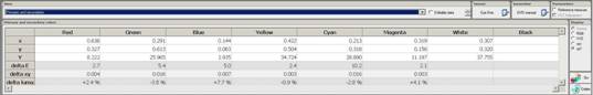 Besonders nützlich und umfassend auch und gerade im Zusammenhang mit der Messung der Luminanz aller Primär- und Sekundärfarben ist die Software CalMAN Professional der Firma SectraCal. In Abbildung7 ist zu sehen, wie die unterschiedlichen Aspekte zur Qualitätssicherung der Farbreproduktion in Messdiagrammen dargestellt werden. Ziel ist es, bei die DeltaE-Werte (hier nach CIE1994) möglichst für alle Farben unter einen Wert von 3 zu bekommen. Ab einem Wert von 3 und geringer gelten die Farben als so gut, dass Differenzen per menschlichem Auge nicht mehr wahrgenommen werden. In Abbildung7 sieht man sehr anschaulich, wie sich das resultierende DeltaE aus unterschiedlichen Komponenten (Delta xy im CIE Gamut graphisch repräsentiert) sowie DeltaHue und Delta-Luminanz etc. zusammensetzt.