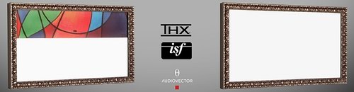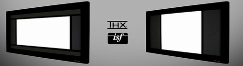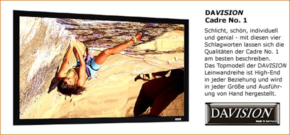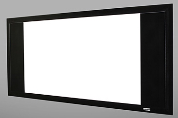 Eine noch einfachere und besonders kostengünstige Lösung bietet Davision mit seiner Cadre "masque" an (Bild oben). Wie Fensterläden befinden sich rechts und links innerhalb des Spannrahmens zwei Maskierungsstreifen, die durch Scharniere auf- und zugeklappt werden können. Sieht man sich einen Cinemascope-Film an, so öffnet man die Maskierungen und nutzt die Leinwand in voller Breite. Bei den "kleineren" 16:9 Filmen schließt man sie und erhält so wieder den perfekt schwarzen Samtrahmen um das Bild.