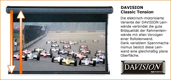 Dies sieht alles sehr einfach aus und gerade dieser Umstand verleitet dazu, die "erstbeste" Rollo-Leinwand zu erstehen, es entscheidet nicht selten alleine der Preis. Doch wer eine billige Leinwand kauft, spart nicht selten am falschen Ende, denn tatsächlich ist die Technik der Leinwand nicht so trivial, wie man vermuten mag, im Gegenteil: Eine große Schwierigkeit bei hängenden Leinwänden ist eine gleichmäßige, wellenfreie Projektionsoberfläche. Da bei einer Rollolösung das Tuch nicht gespannt ist, ist eine wellenfreie Leinwand fast unmöglich. Aber nichts ist störender, als große Wellen in der Projektion, denn gerade horizontale Kameraschwenks zeigen dann störende Verzerrungen. "Billig-Modelle" leiden fast immer unter dem Problem der Wellenbildung, manche früher, andere später. Im Laufe der Monate bilden sich meist in den Randbreichen leichte Wölbungen, die sich im Bild verstärkt bemerkbar machen. Lösen kann man dieses Problem im Nachhinein nicht mehr, wen es stört, der muss eine neue Leinwand anschaffen. Bessere Varianten bestehen aus einem dickeren Projektionstuch, das zudem an den Randbereichen leichte "Ohren" aufweist, sprich sich nur in den letzten 4 Zentimetern, im schwarzen Rahmen wölbt. Durch diese Randwölbungen gelingt es, die eigentliche Projektionsfläche dauerhaft eben zu halten. Besonders effektiv und frei von jeglichen Falten oder Wellen sind so genannte "Tension-Leinwände". Bei diesen Modellen sorgt ein seitliches Seilspannsystem dafür, dass das Tuch in der Breite gestrafft wird und so wie eine Rahmenleinwand gespannt ist. Dies ist sicherlich die perfekte Lösung, die auch über Jahre hinweg eine gleich bleibende Qualität gewährleistet.