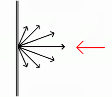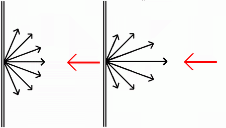 Wie sollte sich eine mattweiße Leinwand im Idealfall verhalten? Wie ihr Name schon sagt sollte sie matt sein (d.h. nicht spiegeln) und möglichst neutral weiß sein. Neutral weiß bedeutet, dass sie eintreffendes Licht komplett reflektiert und keine Spektralanteile absorbiert. Tut sie dies, so hat sie keinen Einfluss auf die Farbdarstellung. In Sachen Farbneutralität können wir Entwarnung geben: Die meisten Modelle, auch günstigere, sind farbneutral. Kein Wunder, wären sie es nicht, würden sie auch nicht weiß, sondern gelblich, grünlich bläulich etc. wirken. Nicht so perfekt verhalten sich aber viele Billigfabrikate, wenn es um die Eigenschaft "matt" geht. Im Idealfall soll eine solche Leinwand das eintreffende Licht gleichmäßig in alle Winkel abstrahlen. Nur dann ist sie frei von jeglichem Hotspot und schränkt den Betrachtungswinkel der Zuschauer nicht ein. Skizziert sieht dies so aus:
