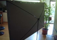 5.1.2 Reflektierend, nicht durchlässig Eine Leinwand mit einem Gain von 1,0 soll das Licht möglichst unverfälscht reflektieren. Unverfälscht bedeutet, dass, abgesehen von der beabsichtigten Streuung, das Licht des Projektors ohne große Verluste reflektiert werden soll. Im Idealfall geht gar kein Licht verloren. In der Praxis sieht es meist anders aus. Je nach Tuchdicke gelangt ein gewisser Teil durch die Leinwand und verringert so die Helligkeit des Bildes. Besonders günstige Tücher sind so dünn, dass der Verlust durch Transparenz so groß ist, dass der Projektor sichtbar an Brillanz verliert. Aber auch bei Qualitätsleinwänden ist ein gewisser Verlust meist unvermeidbar. Streng genommen haben daher die meisten Leinwände nicht den angegebenen Gain von 1,0, sondern leicht darunter. Dies ist nicht weiter tragisch, da sich dieser Verlust im geringen Prozentanteil hält und so vom Auge kaum wahrgenommen wird. Unschön kann es dann werden, wenn hinter der Leinwand sich Wände oder Möbel befinden, die von der Rückseite der Leinwand störend beleuchtet werden. Mit den uns zur Verfügung gestellten Cadre-Testleinwänden haben wir das Phänomen anschaulich dokumentiert. Wir beleuchten die Vorderseite (Tuch "Vilo") mit einem Bild, einer mattweißen Leinwand entsprechend wird es gleichmäßig und hell reflektiert. Überraschend wird es, wenn man auf die Rückseite der Leinwand blickt: