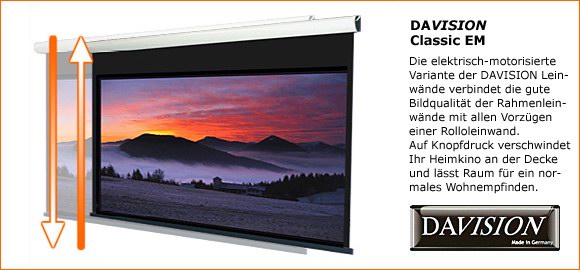 - Vierter Aspekt "Installationsart": Elektrisch herunterfahrbare Multiformatleinwand mit Seilzugspannung