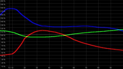 der Strecke" ![]() Über die hohen Helligkeitslevel hinweg fehlt bis zu 40 % Rot im Bild. Blau hingegen ist grundsätzlich zu stark vertreten. Dadurch wird die Farbtemperatur zu kühl, die akkuraten Farben sind nicht gewährleistet. Diesen Rotmangel kann man per Bildmenu nicht ausgleichen. Abhilfe sorgt ein Farbfilter: Er filtert die zu hohen Blau & Grünanteile aus dem Maximal-Licht heraus, bei zusätzliche Optimierung stimmen die Pegel wieder: