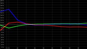 Bei einem Kontrast von ca. 630:1 ist ein Panasonic PT-AE 500 in der Lage, perfekte Farben darzustellen. Der Rot- Grün- und Blauanteil ist stets optimal: Wir wollen den Kontrast erhöhen und stellen die Bildparameter entsprechend ein. Somit erreichen wir einen Kontrast von 1000:1, eine Steigerung von 50%(!) Das Lampenspektrum des Projektors hat aber mehr Blau- & Grünanteile