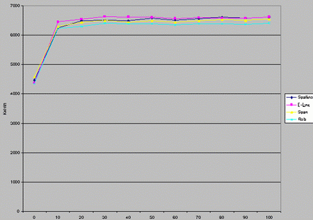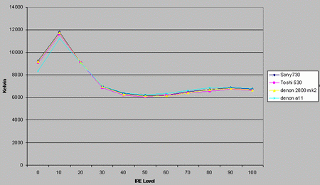 Zur doppelten Absicherung haben wir den selben Versuch mit einer anderen Player-Kombination (Einsteigergerät: Toshiba SD 530, Mittelklasse: Sony DVP-NS 730, Gehobene Klasse: Denon DVD 2800 und High-End: Denon DVD-A11) in Verbindung mit einem durch Projektor-Tuning vorkalibrierten Sanyo PLV-Z2 durchgeführt. Auch hier variieren die Ergebnisse kaum: