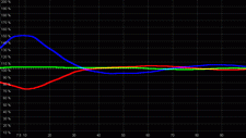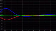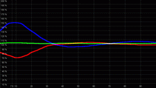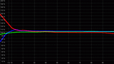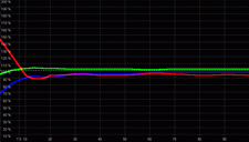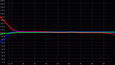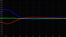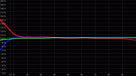 Wieder messen wir die Helligkeitsverteilung: Praktisch keine Abweichung ist festzustellen. Dieses zunächst überraschende Ergebnis ist leicht durch die Theorie zu belegen: Wieder muss man sich vor Augen führen, wie Colorfacts die Helligkeitsverteilung misst: Es werden 11 Grauflächen hintereinander auf die Leinwand projiziert, jede Graufläche stellt ein eigenes Testbild dar. Bei einem dunklem Level, z.B. 20 IRE, gelangt nur relativ wenig Streulicht