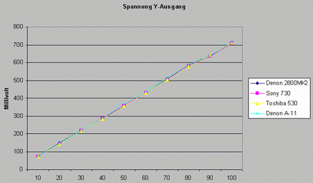 Die Helligkeitsverteilung und der Kontrast werden ebenfalls mit monochromen Grau-Testbildern gemessen. Tatsächlich sind es die selben Testbilder wie zur Farbtemperaturmessung. Wie bereits erläutert, werden graue Bilder ausschließlich vom Y-Signal erzeugt. Die Helligkeitsinformation (sprich Graulevel) wird dabei nach einfachstem Prinzip von der Spannung bestimmt. Im Bereich von 0 bis 700 mV entspricht jede Spannung einer Helligkeit, das Verhältnis ist linear mit der Steigung "1". Eigentlich ist dadurch die Spannungsverteilung normiert, d.h. jede Helligkeitsstufe der DVD muss einer bestimmten, festgelegten Spannung entsprechen. Durch Bauteiltoleranzen in den DVD-Playern können aber Ungenauigkeiten entstehen. Wie groß sind diese Abweichungen und damit der Einfluss des DVD-Players auf die Helligkeitsverteilung? Wir haben die Signalpegel verschiedener DVD-Player (Einsteigergerät: