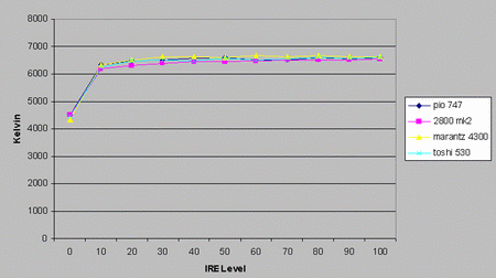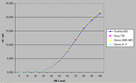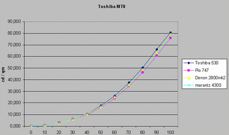 Die Unterschiede sind kaum zu erkennen. Dementsprechend gering sind die Auswirkungen der tatsächlichen Helligkeitsverteilung auf der Leinwand. Zur Überprüfung haben wir wieder zwei Testreihen durchgeführt. Bei der ersten wurden wieder ein Toshiba 530, ein Marantz 4300, ein Denon 2800 MK II und ein Pioneer 747 an einen Toshiba MT-8 angeschlossen: