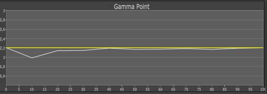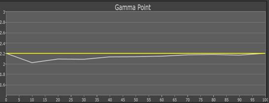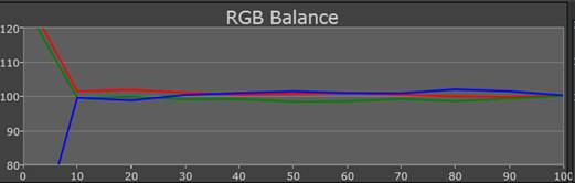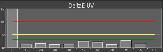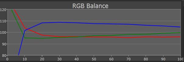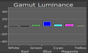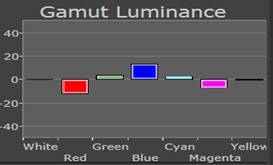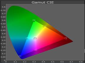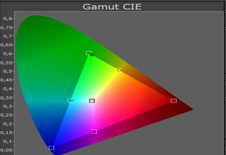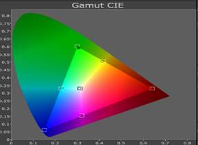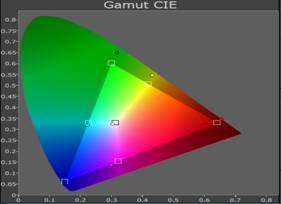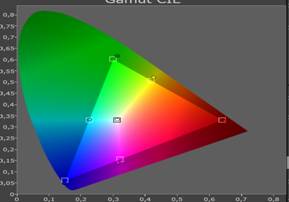 Für eine akkurate Farbdarstellung entscheidend sind die normgemäße Abstimmung der drei Grundfarben (Farbraum) und die normgemäße Abstimmung der Farbmischung (Farbtemperatur). Beide werden definiert durch die HDTV-Videonorm. Betrachten wir zunächst den typischen ab Werk kalibrierten Farbraum eines fabrikneuen HW55: