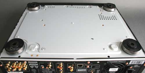1. Ausstattung Das Äußere des Players macht einen ansprechenden Eindruck, die Front besteht allerdings nicht aus Metall, sondern hochglänzendem schwarzen Kunststoff, wirkt aber trotzdem hochwertig. Durch die horizontale Teilung der Frontblende könnte man auf die Idee kommen, der untere Teil wäre eine Klappe, hinter der sich weitere Bedienelemente verbergen, was aber nicht der Fall ist. Es sind somit am Gerät nur die wichtigsten Funktionen bedienbar. Das Display ist einzeilig und hat eine Zeichenhöhe von ca. 10 Millimetern. Der Boden des Gehäuses ist mit einer Zusätzlichen Stahlplatte verstärkt, was bei dem recht großen und schweren Gerät für eine gute Stabilität sorgt.