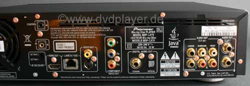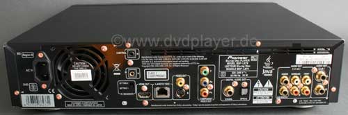 Auf der Rückseite fällt als erstes der Lüfter auf, wodurch bei vielen Audiophilen alle Alarmglocken angehen. Glücklicherweise ist der Lüfter aber offenbar temperaturgesteuert und läuft nur gelegentlich mit sehr geringer Drehzahl und damit nahezu unhörbar. Die Bildausgabe erfolgt natürlich über HDMI, aber auch einen Komponentenausgang sowie eine S-Video und Composite Buchse gibt es. Auf einen Scartausgang wurde verzichtet. Im Audiobereich ist ein koaxialer und ein optischer Digitalausgang, ein 5.1 Analogteil und ein separater Stereoausgang vorhanden. Der HDMI Ausgang entspricht leider nicht dem Standard "1.3", erst ab dieser Version wäre aber die Ausgabe der neuen hochauflösenden Tonformate Dolby True HD und DTS-HD Master Audio möglich. Diese Beschränkung erscheint uns ein wenig unverständlich, denn einen Player dieser Preisklasse möchte man in der Regel einige Zeit nutzen, ohne dass es schon in Kürze veraltet sein wird. Wer in Zukunft auf Dolby TrueHD oder DTS-HD nicht verzichten will, der muss demnach weiter auf ein anderes Modell warten. Neben der vollen 1080p Auflösung kann man den HDMI Ausgang natürlich auch auf die geringeren Auflösungen (720p / 576p / 480p) herunterschalten.