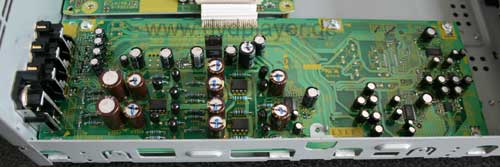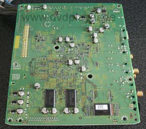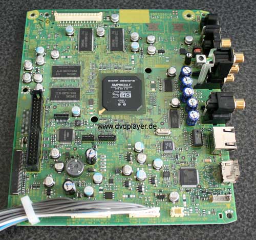 Auch auf der Unterseite des Mainboards fand sich keine Überraschung. Eine kleine Besonderheit ist die Beschaltung des koaxialen Digitalausgangs, hier verspricht ein zusätzlicher Treiberbaustein und ein abgleichbarer Übertrager ein jitterarmes Signal. In dem SMP 8634 läuft also die gesamte Steuerung des Players, die MPEG-Decodierung sowie auch das De-interlacing 24p Ausgabe und Scaling ab. Auch die analogen Videosignale kommen direkt aus diesem Chip. Im Audiobereich hat man sich mehr Mühe gegeben und auf bewährtes gesetzt: Burr-Brown D/A Wandler und Operationsverstärker, Silmic Elkos, Folienkondensatoren und eine saubere Signalführung lassen eine Audio Ausgabe auf hohem Niveau erwarten.