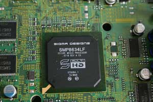 Das Laufwerk ist ein Pioneer BDV-102-XP mit IDE Schnittstelle, offenbar ein „normales“ Blu-ray Laufwerk aus dem PC Bereich. Auf der Hauptplatine fällt als erstes der große Sigma Designs SMP8634LF Chip auf. Der SMP8630 ist ein "Secure Media" Prozessor und unterstützt WMV9, MPEG-2, MPEG-4.10, MPEG-4.2, SMPTE 421M mit umfangreichen Schutzmaßnahmen und Digital Rights Management. HDMI 1.3 könnte der Sigma über einen HDMI Chip Sil-9134 ausgeben, im BDP-LX70 wird aber "nur" ein Sil-9030 für die HDMI Ausgabe verwendet, daher kein HDMI 1.3.