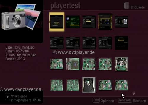Bei automatischer Adressvergabe muß natürlich die IP-Adresse verwendet werden, die unter "Netzwerkkonfiguration" angezeigt wird. Der Player muß antworten, sollte bereits hier keine Verbindung zustande kommen, stimmt etwas mit der Netzwerkhardware oder Router Konfiguration nicht. War dieser Test erfolgreich, kann man sich der Software zuwenden, man benötigt Windows Media Connect, welches man bei Microsoft kostenlos Downlaoden kann. Die aktuelle Version 11 des Windows Media Player beinhaltet bereits die DLNA Funktion. Nach dem Start von WMC sollte unter "Geräte" der BDP-LX70 gefunden werden, unter "Freigabe" kann man seine Verzeichnisse für Musik,Video und Bilddateien angeben. Wir haben es auch mit einem Freeware DLNA Server "TVersity" versucht, leider erkennt diese Software den BDP-LX 70 nicht. Mit der Taste "Home Media Gallery" der Fernbedienung kann man nun zwischen Filme, Fotos und Musik wählen. Folgende Formate werden unterstützt: Filmdateien : MPEG1,MPEG2,WMV (auch HD)