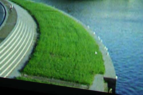 Ein weiterer wichtiger Punkt ist die Skalierung des DVD Materials mit 720x576 Pixeln (PAL) auf die Full HD Auflösung von 1920x1080 Pixeln. Schließlich sollte ein solch teures High-End Gerät auch abwärtskompatibel sein und im Idealfall den alten DVD-Player ersetzen. Der LX-70 erzeugt keine Interferenzen bei der Skalierung, es ist auch kein Pegelverlust bei hohen Auflösungen im Helligkeits- und Farbsignal zu beobachten. Es sind auch keine Doppelkonturen zu beobachten, wie sie bei einer Schärfeanhebung entstehen. Dies alles belegt eine artefaktfreie Umrechnung auf andere Auflösungen. Doch hochwertige Scaler sind mittlerweile in der Lage, durch aufwendige Verfahren mehr Detailauflösung in das Bild hineinzubringen, beispielsweise sei hier die HQV Technologie von Silicon Optix erwähnt, die auch im DVD-Player Denon DVD-2930/3930, HD-DVD Player Toshiba HD-XE1 und im LCD-Projektor Mitsubishi HC-5000 Verwendung findet. Wir haben diese Testszene der HQV Benchmark DVD zur Beurteilung der Skalierung verwendet. Die Bilder wurden von einer 2,5 m breiten Leinwand abfotografiert. Projiziert wurde mit einem Mitshubishi HC-5000. In den oberen Bildern gab der LX-70 576p aus, das Scaling erfolgte also durch den im Mitsubishi eingebauten Silicon Optix Scaler - in den unteren Bildern erfolgte die Skalierung auf 1080p durch den Pioneer. Die Bilder wurden mit den gleichen Kameraeinstellungen aufgenommen und nicht nachbearbeitet.
