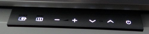 Die Anschlüsse sind komplett im Fuß untergebracht. Bis auf die HDMI Anschlüsse erfolgen alle Kontakte aber über mitgelieferte Adapterkabel, selbst Ethernet muss über einen Adapter zugeführt werden. Wenn man den 9090 mit allen Anschlüssen füttert, ergibt dies einen recht unansehnlichen Adapter-/Kabelsalat, weshalb Samsung auch eine große Auswahl an Kabelbindern beilegt. Der Slot für CI+ Module auf der linken Seite des Fußes ist nicht tief genug gebaut, so dass Module hier 8cm herausragen und die Optik nicht gerade verschönern. Das Bedienungspanel fährt nach leichter Berührung sanft nach vorne aus. Zu bedenken ist, dass bei einer Wandmontage keine mittige Anbringung eines Kabelkanals möglich ist.