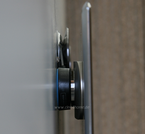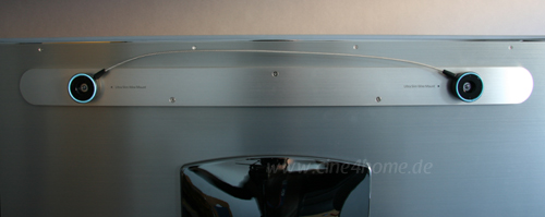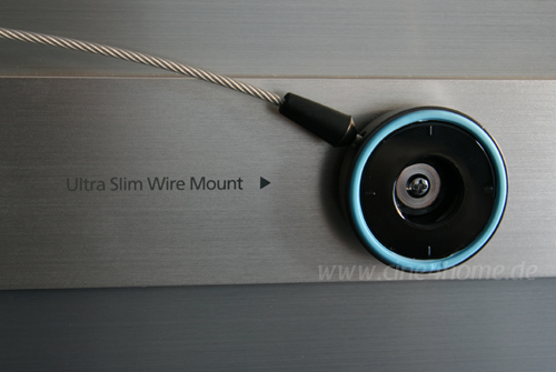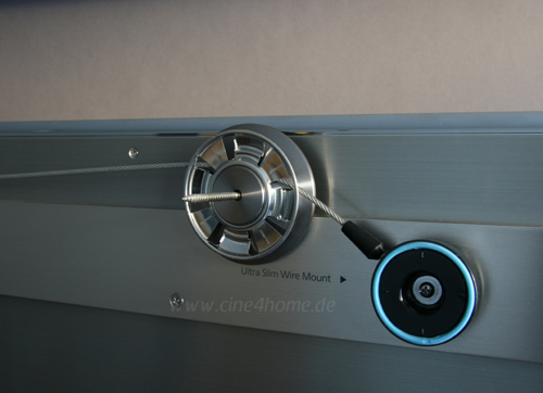 An der Rückseite wird die mitgelieferte Seilaufhängung „Ultra Slim Wire Mount“ angebracht. Sie erinnert an die Seilaufhängung von großen Kunst-Gemälden.
