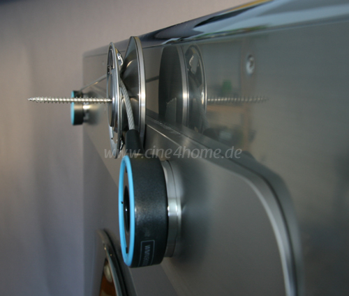 Im Bild oben sieht man das Stahlseil, an dem der Fernseher hängen wird, im Detail. Die angeschraubte schwarze Kunststoffhalterung hat an ihrer Rückseite einen Gummiring, der später an der Wand anliegt und den TV gegen Schläge „puffert“.