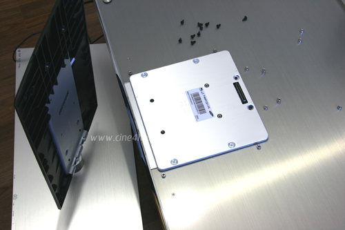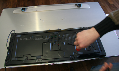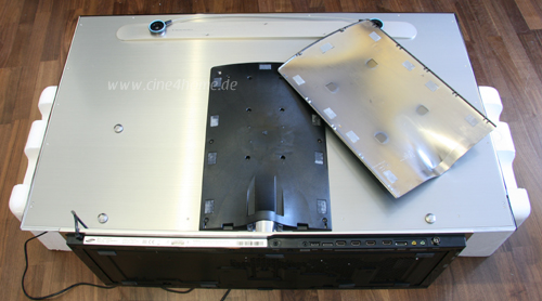 Jetzt wird das System dahinter langsam deutlich, das Elektronikmodul hat dieselbe Steckverbindung wie das Panel, im Standfuß ist praktisch ein Verbindungskabel. Auch sieht man jetzt wieder die aufwändige Materialschlacht des Samsungs, der Fuß ist aus einer massiven Aluplatte gefräst!
