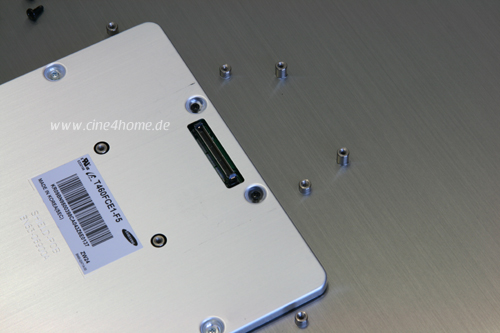 Hier sieht man die Steckverbindung an der Rückseite des Panels und die Gewindebuchsen, an denen der Standfuß angeschraubt war.