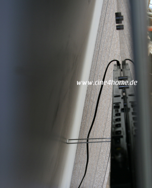 Der Fernseher kann jetzt mit dem Stahlseil an die, hoffentlich gut festgeschraubten, Wandteller gehangen werden. Hier die Ansicht von der Seite.