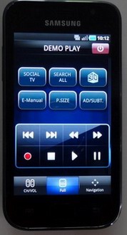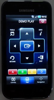 Samsung liefert zwei Fernbedienungen mit. Ein eiförmiges Minimodell, das nur die Kanalwahl und die Lautstärke unterstützt, sowie die auch einzeln erhältliche Touchscreen Fernbedienung „RMC 30“.