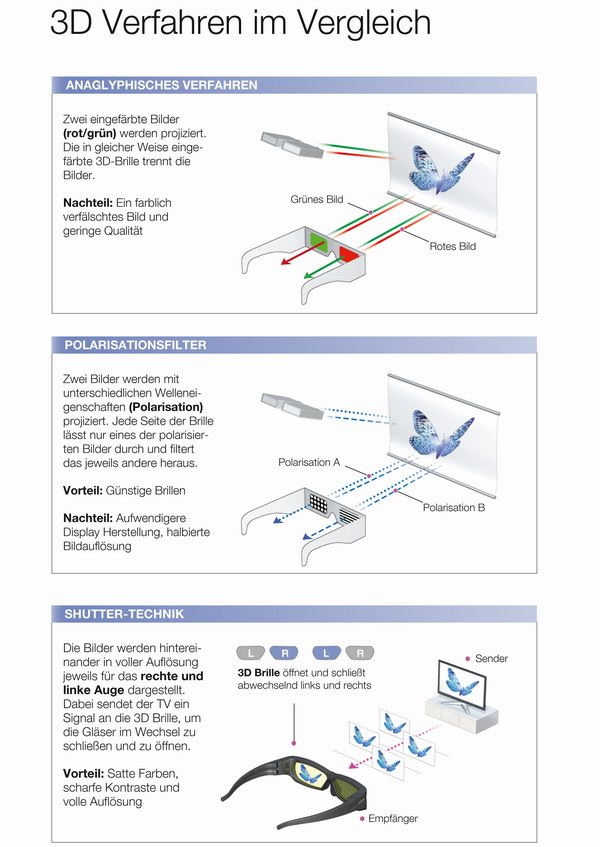 Erfreulich ist in jedem Fall, dass im Fernsehbereich die 3D-Option nicht durch große Aufpreise erkauft werden muss, sondern bereits im günstigen Einstiegssegment geboten wird, wie der Samsung LE-46C750 beweist: Für die 3D-Darstellung bedient er sich dabei der derzeit üblichen Shutter-Brillen: