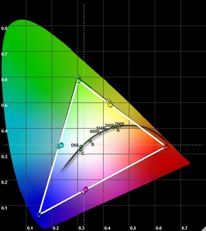 Den resultierenden Farbraum dieser Einstellung sehen wir im Diagramm oben: Es zeigt, dass die Grundfarben, die zur Mischung aller Farben genutzt werden, fast perfekt bei ihren Sollfarben liegen (Ecken der des Dreiecks). Dies gilt nicht nur für ihren Farbton, sondern auch ihre Helligkeit. Die Sekundärfarben Zyan und Magenta und Gelb sind ebenfalls sehr gut abgestimmt.