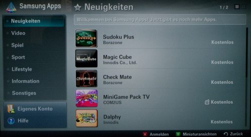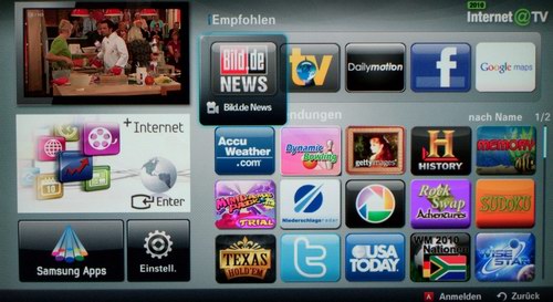 Über das Internet via Kabel oder den optional erhältlichen W-LAN Stick kann man auf eine Vielzahl sogenannter „Samsung Apps“ zugreifen. Wer ein Samsung Handy besitzt, kennt diese Applikationsmöglichkeiten bereits. Es sind sowohl Videodienste à la Youtube als auch Nachrichten, Wetter, Sport sowie eine große Auswahl an Spielen verfügbar. Diese Apps können frei installiert werden, sodass eine Personalisierung sehr einfach möglich ist.