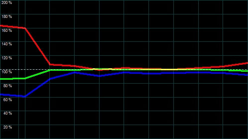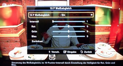 Rot und Grün sind bereits ab Werk nahezu perfekt, Blau fällt nur minimal ab. Wer mehr Perfektion wünscht, kann mittels Messinstrumenten und der RGB-Regler im Weißabgleich des Bildmenüs die Farbtemperatur weiter verfeinern. Für absolute Perfektionisten steht auch ein 10 Punkte Weißabgleich zur Verfügung.