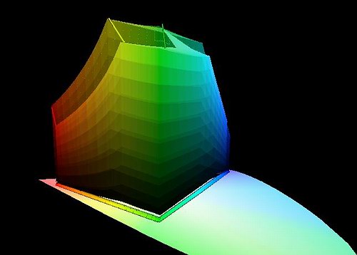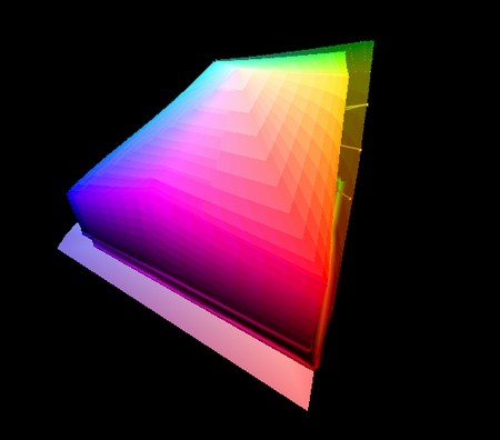 Dass sich in die Grundfarbe Grün soviel Gelb hineinmischt, ist verwunderlich, schließlich soll die Quattron-Technologie die gelbe Farbe komplett in eigene Pixel auslagern. Vermutlich hat man durch diese eingeschränkte Farbreinheit von Grün die Helligkeit des Displays weiter maximieren wollen, allerdings auf Kosten der Farbgenauigkeit.