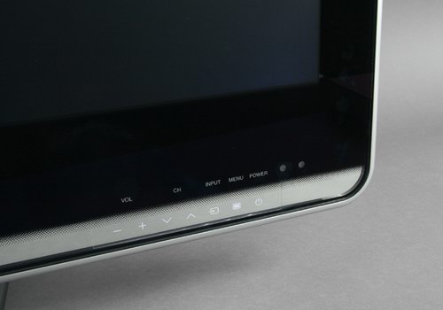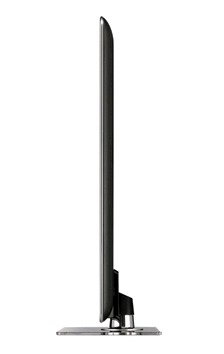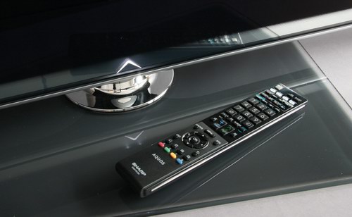 Der Sharp präsentiert sich mit einer durchgehenden, hochglänzenden Front, die von einer abgerundeten Kante eingefasst ist, die man auf den ersten Blick für echtes Aluminium halten könnte und die sich erst bei genauem Hinsehen und Anfassen als Kunststoff entpuppt. Auch könnte man die Front fast für Glas halten, die Spiegelungen in der Oberfläche haben kaum Wellen. Stellt man sich den Fernseher „hochkant“ vor, erinnert das Design sehr an die „i“-Produkte einer bestimmten Obstmarke mit Biss. Bei diesem Vorbild wären aber echtes Aluminium und Glas authentischer gewesen. Immerhin beim Standfuß ist man keine Kompromisse eingegangen, er besteht aus einer massiven Glasplatte mit polierten Kanten.