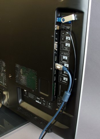 Zur Aufstellung: Sharp gibt in der Anleitung keine Hinweise zu Mindestabständen an, bei Wandmontage wird lediglich die Verwendung der eigenen Wandhalterung empfohlen, weil die Installation mit einer anderen Halterung „instabil“ sein kann. Der Verwendung einer besonders flachen Wandhalterung steht also anscheinend wenig entgegen, was bei diesem nur knapp 4cm tiefen Gerät natürlich eine besonders flache Installation ermöglicht. Allerdings wird dann das Einstecken eines USB Sticks vermutlich zu einer kniffeligen Angelegenheit. In Sachen Aufstellungsflexibilität sind dem Gerät insgesamt kaum Grenzen gesetzt, man kann es problemlos in jeder Schrankwand montieren, den mitgelieferten Designer-Standfuß benutzen oder es wie ein Bild an die Wand hängen, die Edge-LED Technologie macht sich in dieser Hinsicht schon jetzt bezahlt.
