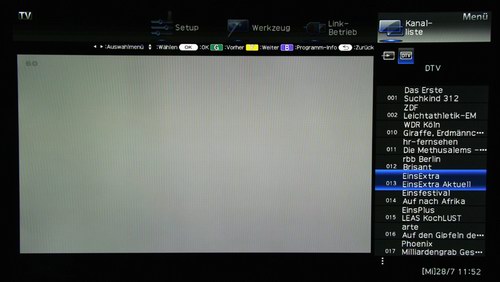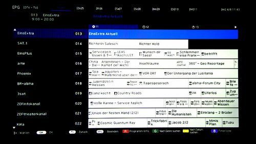 Für das EPG kann man drei verschiedene Layouts wählen, nach dem Öffnen werden immer sofort 10 oder 15 Sender angezeigt, navigiert man mit dem Steuerkreuz durch die Liste, „hängt“ das EPG manchmal für ein oder zwei Sekunden. Intuitiv würde man erwarten, mit der „OK“ Taste die Info zur ausgewählten Sendung zu sehen, doch nicht bei Sharp: Hier geht das mit der kleinen roten Taste unten links, allerdings passiert nach dem Drücken der Taste sekundenlang erst einmal gar nichts. Alles in allem funktioniert das EPG sehr träge und kostet den Nutzer auf die Dauer mehr Nerven, als ein Blick in die Programmzeitschrift oder ins Internet. Aus diesen Gründen können wir es nicht empfehlen.